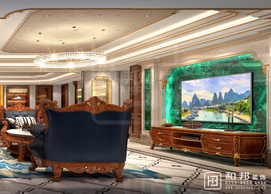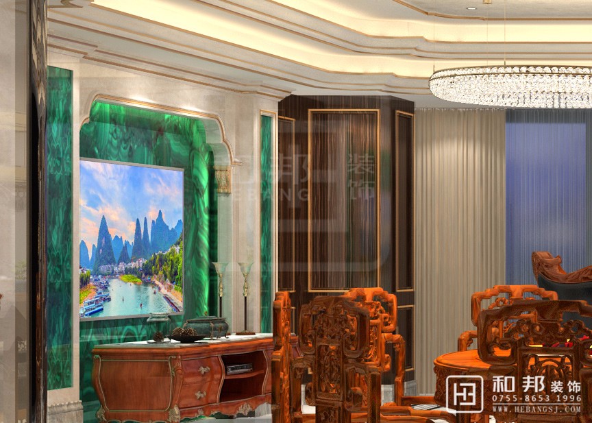 本案從孔雀綠玉石背景墻上彰顯出特意的設計質感,也造就出深淺對比,層次有序的精致風華。