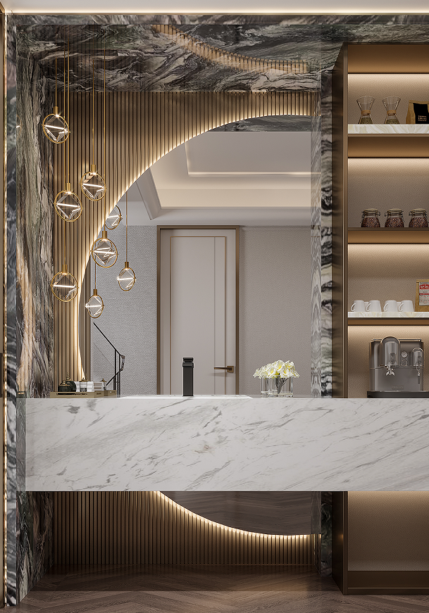 上疊一層多功能家庭活動室滿足聚會、觀影、沙龍等多樣化生活場景,紋理天然的背景奢石、鏡面水紋不銹鋼,幻化成熠熠生輝的發光源在空間中閃耀,為聚會增添了更為閃亮的氛圍。